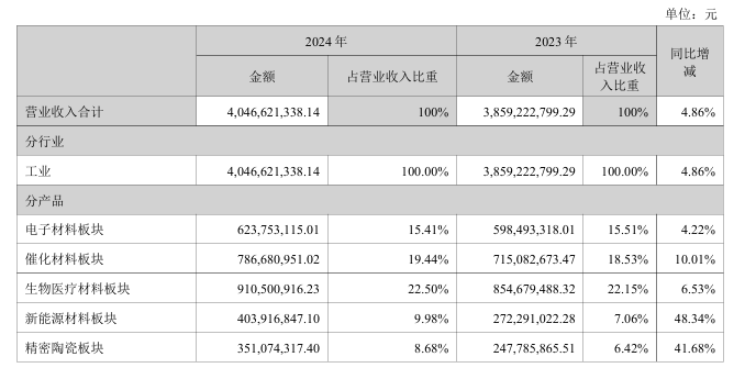 近日,國瓷材料公布2024年年度報告,2024年公司實現(xiàn)營業(yè)收入40.47億元,同比增長4.86%;歸屬于上市公司股東的凈利潤6.05億元,同比增長6.27%;歸屬于上市公司股東的扣除非益的凈利潤經(jīng)常性損5.81億元,同比增長7.05%。公司各業(yè)務板塊表現(xiàn)優(yōu)異。