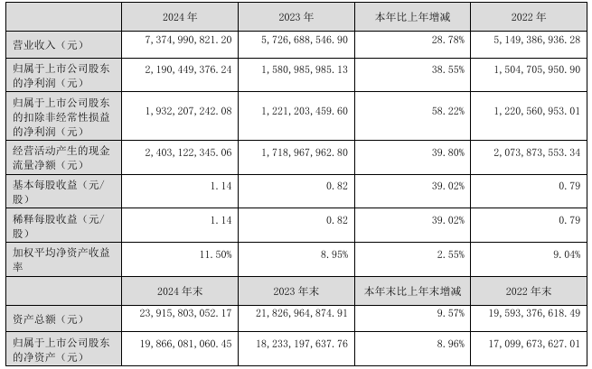 2024年,公司實(shí)現(xiàn)營(yíng)業(yè)收入73.75億元,比上年同期增長(zhǎng)28.78%;歸屬于母公司所有者的凈利潤(rùn)21.9億元,比上年同期增長(zhǎng)38.55%。報(bào)告期內(nèi),公司加大研發(fā)投入,研發(fā)投入金額同比增長(zhǎng)6.83%,占公司營(yíng)業(yè)收入比重7.91%。