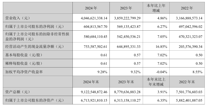 國瓷材料公布的2024年年度報告中顯示,2024年公司實現(xiàn)營業(yè)收入40.47億元,同比增長4.86%;歸屬于上市公司股東的凈利潤6.05億元,同比增長6.27%;歸屬于上市公司股東的扣除非益的凈利潤經(jīng)常性損5.81億元,同比增長7.05%。