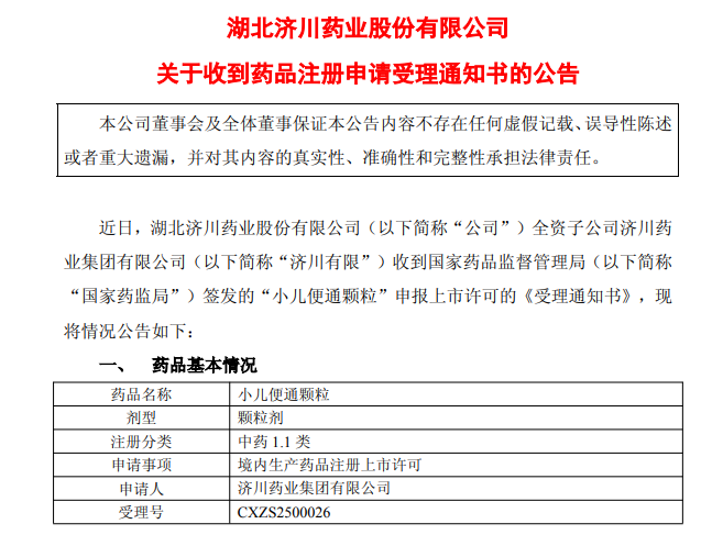 中國粉體網(wǎng)訊 7月8日,湖北濟川藥業(yè)發(fā)布公告,其全資子公司濟川藥業(yè)集團有限公司,收到國家藥品監(jiān)督管理局簽發(fā)的1.1類中藥創(chuàng)新藥小兒便通顆粒申報上市許可的《受理通知書》(CXZS2500026)。