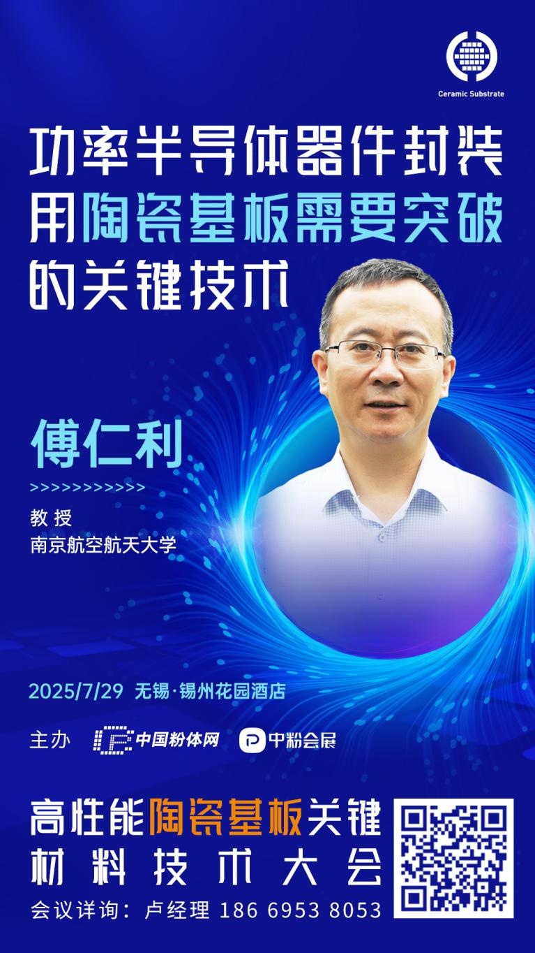 半導(dǎo)體及電子信息產(chǎn)業(yè)的快速發(fā)展對核心材料的性能提出了更高要求。陶瓷基板作為功率半導(dǎo)體器件的關(guān)鍵封裝材料,其導(dǎo)熱性能、機(jī)械強(qiáng)度、可靠性和精密程度直接決定了終端產(chǎn)品的性能與壽命。針對材料研發(fā)、制備工藝、檢測技術(shù)、應(yīng)用場景等核心議題,中國粉體網(wǎng)將于2025年7月29日在江蘇無錫舉辦2025高性能陶瓷基板關(guān)鍵材料技術(shù)大會。屆時,南京航空航天大學(xué)教授傅仁利將作題為《功率半導(dǎo)體器件封裝用陶瓷基板需要突破的關(guān)鍵技術(shù)》的報告。