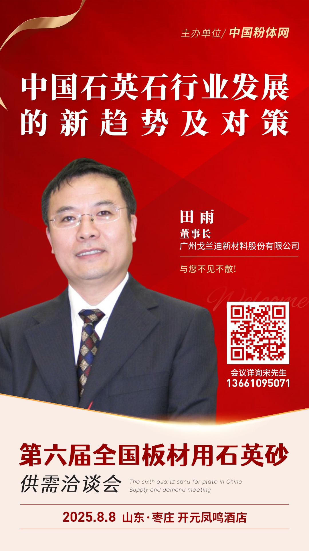 2025年8月8日,由中國粉體網(wǎng)主辦的第六屆全國板材用石英砂供需洽談會(huì)將在山東棗莊召開,廣州戈蘭迪新材料股份有限公司董事長田雨將作《中國石英石行業(yè)發(fā)展的新趨勢(shì)及對(duì)策》的報(bào)告,深度剖析行業(yè)當(dāng)前面臨的痛點(diǎn)難點(diǎn),精準(zhǔn)研判未來技術(shù)突破的核心方向,為行業(yè)發(fā)展撥開迷霧。