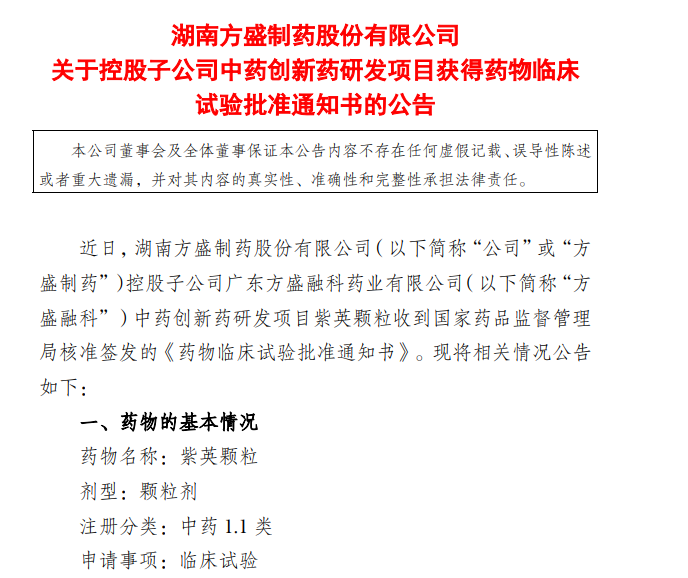 2025年4月、5月,方盛制藥陸續(xù)提交了香芩解熱顆粒和紫英顆粒的新藥臨床申請(qǐng),目前均已獲批臨床。