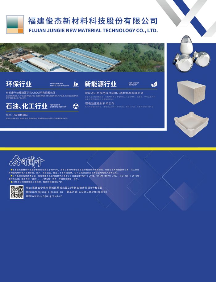 福建俊杰新材料科技股份有限公司成立于1995年,主要從事鋰電池行業(yè)正極材料合成用陶瓷坩堝、環(huán)保行業(yè)用陶瓷蓄熱介質(zhì)、化工行業(yè)用陶瓷塔填料等產(chǎn)品的開發(fā)、生產(chǎn)銷售業(yè)務(wù)。經(jīng)過二十多年的發(fā)展,公司已成為國內(nèi)知名的工業(yè)用陶瓷產(chǎn)品供應(yīng)商。