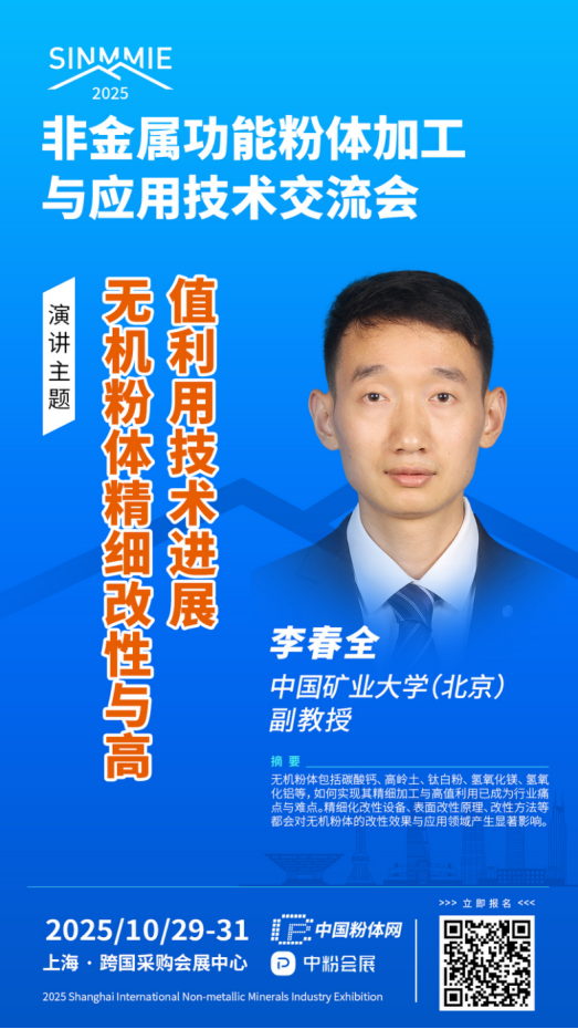 10月29-31日,北京粉體技術(shù)協(xié)會(huì)、柏德英思展覽(上海)有限公司、山東中粉會(huì)展服務(wù)有限公司將在上?鐕少彆(huì)展中心聯(lián)合主辦“上海國際非金屬礦工業(yè)展覽會(huì)(SINMMIE2025)”,展會(huì)現(xiàn)場將同期舉辦“非金屬功能粉體加工與應(yīng)用技術(shù)交流會(huì)”,屆時(shí)將邀請(qǐng)中國礦業(yè)大學(xué)(北京)李春全副教授作《無機(jī)粉體精細(xì)改性與高值利用技術(shù)進(jìn)展》主題報(bào)告,講解碳酸鈣、高嶺土、鈦白粉、氫氧化鎂、氫氧化鋁等粉體材料精細(xì)加工技術(shù)、設(shè)備,并展望發(fā)展趨勢(shì),現(xiàn)場與參會(huì)嘉賓一起交流互動(dòng)。