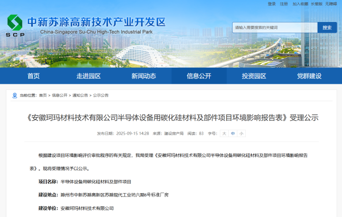中國(guó)粉體網(wǎng)訊 近日,滁州市人民政府發(fā)布了關(guān)于《安徽珂瑪材料技術(shù)有限公司半導(dǎo)體設(shè)備用碳化硅材料及部件項(xiàng)目環(huán)境影響報(bào)告表》受理公示。