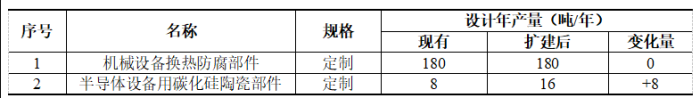 文件顯示,安徽珂瑪科技將在滁州市中新蘇滁高新技術(shù)產(chǎn)業(yè)開(kāi)發(fā)區(qū)蘇滁現(xiàn)代工業(yè)坊陸號(hào)廠房進(jìn)行擴(kuò)建,項(xiàng)目建成后可年產(chǎn)290噸機(jī)械設(shè)備換熱防腐部件和10噸半導(dǎo)體設(shè)備用碳化硅陶瓷部件,目前,年產(chǎn)180噸機(jī)械設(shè)備換熱防腐部件和8噸半導(dǎo)體設(shè)備用碳化硅陶瓷部件生產(chǎn)裝置已建成,已通過(guò)自主驗(yàn)收并完成排污許可登記。由于6號(hào)廠房空間限制,剩余110噸機(jī)械設(shè)備換熱防腐部件和2噸半導(dǎo)體設(shè)備用碳化硅陶瓷部件生產(chǎn)線不再建設(shè)。
