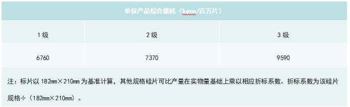 明確能耗等級(jí):太陽能電池用硅單晶1級(jí)綜合能耗≤2.27kgce/kg,硅單晶片(182mm×210mm標(biāo)片)1級(jí)能耗≤6760kgce/百萬片,其他規(guī)格需按折標(biāo)系數(shù)換算,推動(dòng)企業(yè)通過工藝優(yōu)化降低單位能耗。