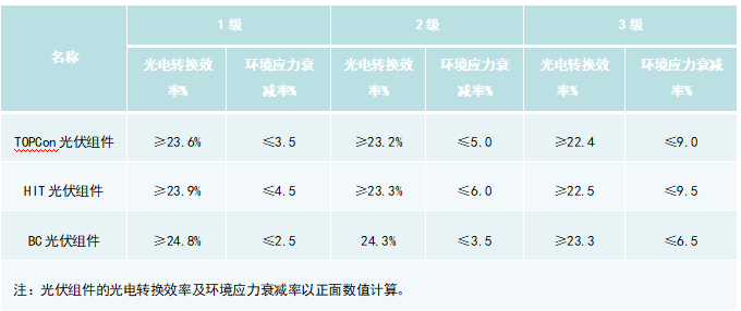組件:效率與雙面率雙高:TOPCon組件1級(jí)光電轉(zhuǎn)換效率≥23.6%、環(huán)境應(yīng)力衰減率≤3.5%,HJT組件1級(jí)效率≥23.9%,且HJT組件雙面率需≥85%,BC組件雙面率≥70%,倒逼企業(yè)研發(fā)高效、低衰減產(chǎn)品。
