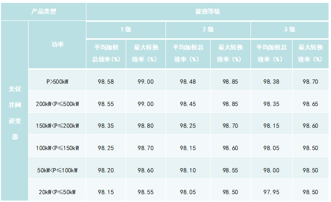逆變器:分功率段定標(biāo)準(zhǔn):500kW以上集中式逆變器1級(jí)平均加權(quán)總效率≥98.58%,20-50kW組串式逆變器1級(jí)效率≥98.15%,精準(zhǔn)覆蓋不同應(yīng)用場景,確保發(fā)電全鏈路能效最優(yōu)。