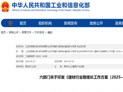 中國粉體網(wǎng)訊 9月24日,工信部等六部門發(fā)布關(guān)于印發(fā)《建材行業(yè)穩(wěn)增長工作方案(2025—2026年)》的通知。