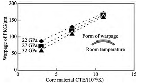 基板核心層材料的CTE對(duì)基板翹曲的影響 來(lái)源:Jiang. Semiconductor chip and package co-design and assembly for dual use in flip chip and wirebond BGA packages