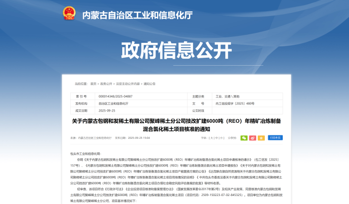中國粉體網(wǎng)訊 內(nèi)蒙古包鋼和發(fā)稀土有限公司聚峰稀土分公司近日獲得官方核準(zhǔn),將實(shí)施技改擴(kuò)建6000噸REO(稀土氧化物)稀土分離生產(chǎn)線項(xiàng)目。