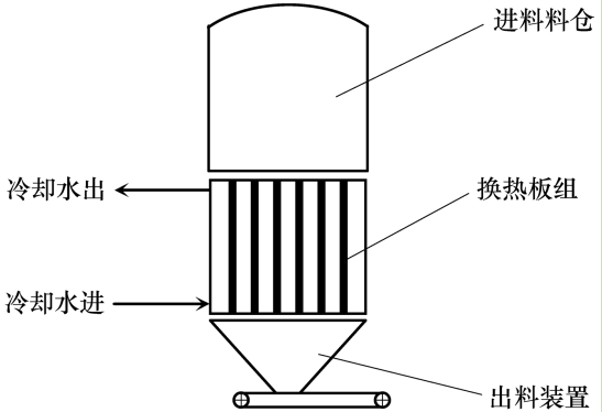 粉體流換熱器是一種間接換熱的粉體冷卻設(shè)備,通常由進(jìn)料倉(cāng)、傳熱板組、下料倉(cāng)等組成。這種換熱方式結(jié)合了粉體密相輸送和傳統(tǒng)板式換熱器的設(shè)計(jì)思路,高溫固體粉料依靠自身重力自流通過(guò)板式換熱器的狹窄通道,與另一側(cè)的冷卻水進(jìn)行間接換熱,達(dá)到將物料冷卻的目的,必要時(shí)可以副產(chǎn)熱水,回收熱量。