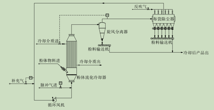 以臥式流化床為例,粉料在流態(tài)化狀態(tài)下依次通過(guò)多個(gè)流化腔室,每個(gè)流化腔室下均有冷卻氣體通入,氣體與粉料直接接觸換熱,達(dá)到逐級(jí)冷卻的目的。換熱后的氣體從頂部引出,經(jīng)旋風(fēng)分離器和布袋除塵器后排空。也可以將氣體間接冷卻后循環(huán)使用。