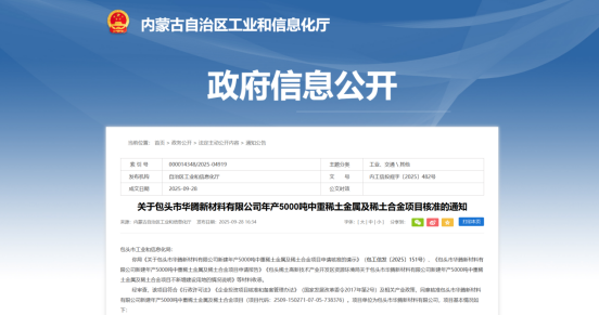 近日,內(nèi)蒙古自治區(qū)工業(yè)和信息化廳正式核準(zhǔn)通過包頭市華騰新材料有限公司新建年產(chǎn)5000噸中重稀土金屬及稀土合金項目。項目總投資1億元。建設(shè)周期為12個月。