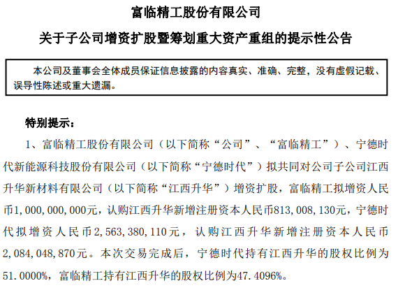 中國(guó)粉體網(wǎng)訊 9月29日,富臨精工公告,公司與寧德時(shí)代擬共同對(duì)江西升華增資擴(kuò)股,公司擬增資10億元,認(rèn)購(gòu)江西升華新增注冊(cè)資本8.13億元,寧德時(shí)代擬增資25.63億元,認(rèn)購(gòu)江西升華新增注冊(cè)資本20.84億元。本次交易完成后,寧德時(shí)代持有江西升華的股權(quán)比例為51%,公司持有江西升華的股權(quán)比例為47.4096%,江西升華將成為寧德時(shí)代的控股子公司。