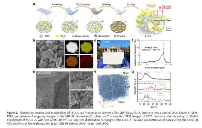 研究團(tuán)隊(duì)創(chuàng)新性地采用MIL-96衍生的分級結(jié)構(gòu)氧化鋁顆粒,該顆粒具有優(yōu)化的幾何參數(shù)和高孔隙率,能夠增強(qiáng)光背向散射。將這些顆粒嵌入玻璃基質(zhì)中,形成了低溫共燒陶瓷(LTCC),在低于1000°C的溫度下實(shí)現(xiàn)燒結(jié),顯著降低了能耗。