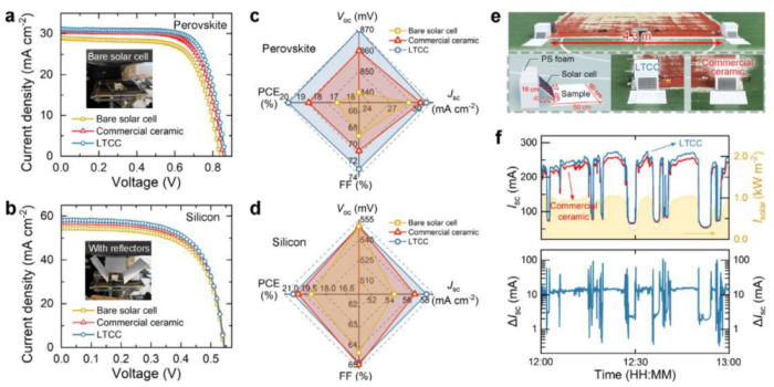 在光伏集成測試中,LTCC作為反射基底顯著提升了鈣鈦礦和硅基太陽能電池的轉(zhuǎn)換效率。戶外實(shí)驗(yàn)中,LTCC使光伏模塊在中午時(shí)段短路電流平均提升10.46 mA,且在陰天條件下仍能保持性能優(yōu)勢。