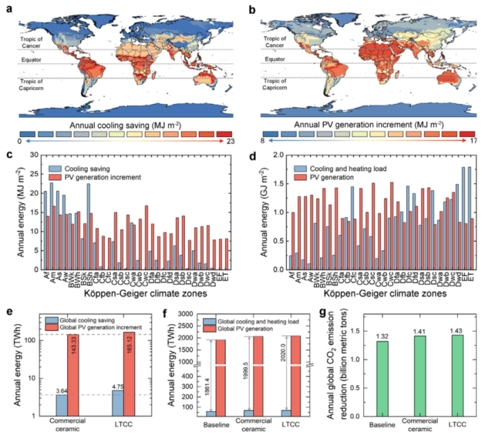 全球能源模擬顯示,LTCC在赤道地區(qū)年冷卻節(jié)能可達(dá)23 MJ/m²,光伏發(fā)電增量達(dá)17.6 MJ/m²。按氣候分區(qū)分析,多數(shù)地區(qū)可實(shí)現(xiàn)冷卻與光伏發(fā)電的平衡。整體來看,LTCC全球推廣后年節(jié)電量可達(dá)4.75 TWh,光伏發(fā)電增量165.12 TWh,預(yù)計(jì)年二氧化碳減排量達(dá)14.3億噸。