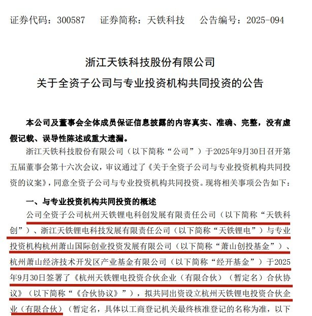 據(jù)公告消息,天鐵科技全資子公司杭州天鐵鋰電科創(chuàng)發(fā)展有限責(zé)任公司(簡稱:天鐵科創(chuàng))、浙江天鐵鋰電科技發(fā)展有限責(zé)任公司(簡稱:天鐵鋰電)與專業(yè)投資機(jī)構(gòu)杭州蕭山國際創(chuàng)業(yè)投資發(fā)展有限公司(簡稱:蕭山創(chuàng)投基金)、杭州蕭山經(jīng)濟(jì)技術(shù)開發(fā)區(qū)產(chǎn)業(yè)基金有限公司(簡稱:經(jīng)開基金)于2025年9月30日簽署了《杭州天鐵鋰電投資合伙企業(yè)(有限合伙)(暫定名)合伙協(xié)議》,擬共同出資設(shè)立杭州天鐵鋰電投資合伙企業(yè)(有限合伙)(暫定名,具體以工商登記機(jī)關(guān)最終核準(zhǔn)登記的名稱為準(zhǔn),簡稱“合伙企業(yè)”)。