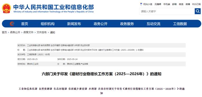 9月24日,工信部等六部門發(fā)布關(guān)于印發(fā)《建材行業(yè)穩(wěn)增長工作方案(2025—2026年)》的通知。