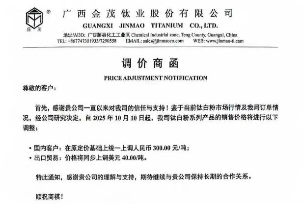 10月10日左右,龍佰集團(tuán)、中核華原鈦白、安納達(dá)、廣西金茂鈦業(yè)、藍(lán)星大華化工、潛江方圓鈦白、云南大互通鈦業(yè)、江蘇鎮(zhèn)鈦化工、攀枝花恒通鈦業(yè)、山東金海鈦業(yè)等多家企業(yè)的鈦白粉開始漲價(jià),形成一波集體漲價(jià)浪潮,國內(nèi)市場調(diào)價(jià)幅度普遍鎖定300元/噸,國際市場上調(diào)40-50美元/噸不等。