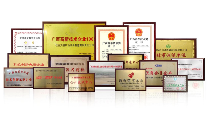 桂林鴻程先后榮獲“高新技術(shù)企業(yè)”、“國(guó)家知識(shí)產(chǎn)權(quán)優(yōu)勢(shì)企業(yè)”、“廣西工業(yè)龍頭企業(yè)”、“廣西制造業(yè)單項(xiàng)冠軍示范企業(yè)”、“廣西科技進(jìn)步獎(jiǎng)一等獎(jiǎng)”等稱號(hào),榮獲擺式磨粉機(jī)分級(jí)機(jī)、磨粉機(jī)開路收集系統(tǒng)、磨粉機(jī)布袋收集系統(tǒng)、環(huán)輥磨減震基礎(chǔ)、雷蒙磨主機(jī)內(nèi)分料結(jié)構(gòu)、磨粉機(jī)遠(yuǎn)程智能監(jiān)控系統(tǒng)等在內(nèi)專利證書。