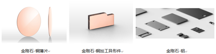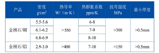 高導熱金剛石/銅、金剛石/鋁復合材料具有熱導率高、密度低、熱膨脹系數(shù)低等特點。金剛石/銅產(chǎn)品熱導率>550W/(m·K),最高達700W/(m·K),最小厚度0.5mm。