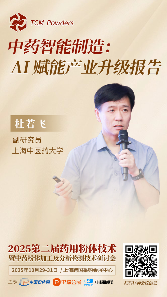 聚焦“從粉體技術(shù)、論中藥工藝”為主題,10月29-31日,中國(guó)粉體網(wǎng)將于2025IPIE上海高端粉體裝備與科學(xué)儀器展覽會(huì)期間,同期舉辦“2025第二屆藥用粉體技術(shù)暨中藥粉體加工及分析檢測(cè)技術(shù)研討會(huì)”,屆時(shí)上海中醫(yī)藥大學(xué)副研究員杜若飛將為大家?guī)?lái)《中藥智能制造:AI賦能產(chǎn)業(yè)升級(jí)報(bào)告》的主題報(bào)告。報(bào)告主講人將探討中藥智能制造的背景、研究現(xiàn)狀與發(fā)展前景,重點(diǎn)分析人工智能(AI)在中藥產(chǎn)業(yè)中的應(yīng)用。發(fā)展至今,AI技術(shù)在中藥生產(chǎn)、工藝優(yōu)化、質(zhì)量控制和數(shù)據(jù)分析等方面發(fā)揮了關(guān)鍵作用?鐚W(xué)科融合與AI賦能將成為中藥智能制造的未來(lái)發(fā)展方向。