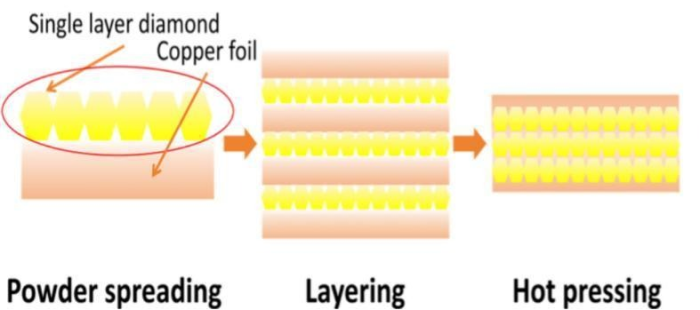 此前,哈爾濱工業(yè)大學(xué)朱嘉琦、曹文鑫團(tuán)隊提出的高溫層壓工藝可實(shí)現(xiàn)極高的尺寸精度,與傳統(tǒng)熱壓工藝相比,該工藝操作更簡便且制造成本更低,可解決表面光潔度差、尺寸精度低及性能問題。主要是采用鎢涂層金剛石和銅片作為原料,將鎢涂層金剛石置于銅片上,分層后進(jìn)行熱壓。該工藝?yán)勉~金屬在高溫下具有高塑性和低流動應(yīng)力的特性,使銅填充金剛石顆粒間的孔隙并使板材致密化。