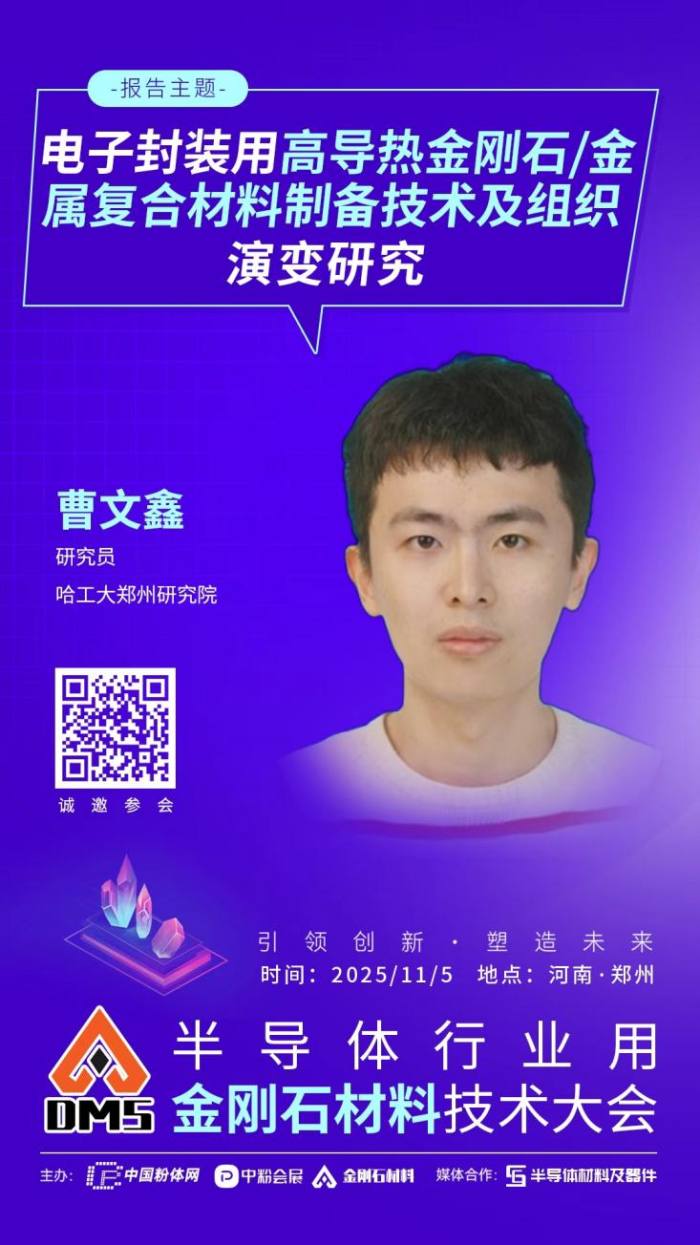 2025年11月5日,中國粉體網(wǎng)將在河南•鄭州舉辦“2025半導(dǎo)體行業(yè)用金剛石材料技術(shù)大會”。屆時,我們邀請到哈工大鄭州研究院曹文鑫研究員出席本次大會并作題為《電子封裝用高導(dǎo)熱金剛石/金屬復(fù)合材料制備技術(shù)及組織演變研究》的報告。報告將圍繞高導(dǎo)熱金剛石/金屬復(fù)合材料,闡述金剛石鎢鍍層制備、結(jié)構(gòu)機(jī)制及創(chuàng)新性高溫層壓工藝,為高熱導(dǎo)率復(fù)合材料開發(fā)提供理論與技術(shù)支撐。