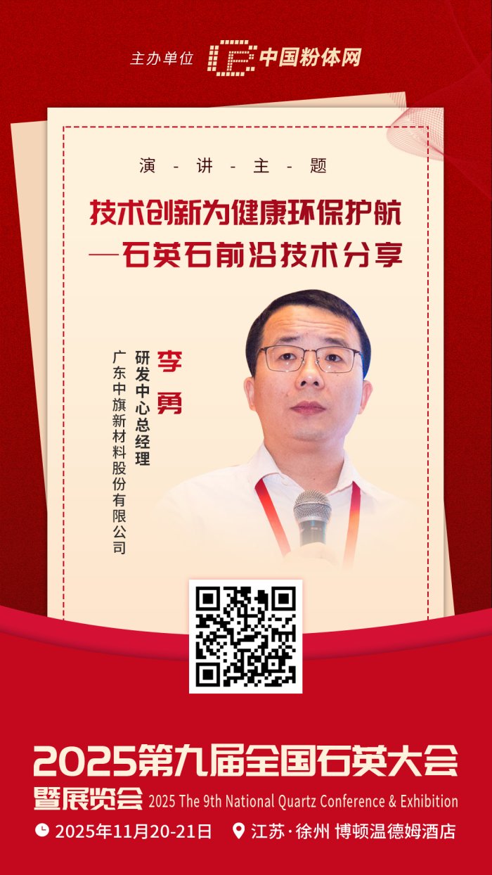 2025年11月20-21日,中國粉體網(wǎng)將在江蘇徐州舉辦“2025(第九屆)全國石英大會暨展覽會”。屆時,廣東中旗新材料股份有限公司研發(fā)中心總經(jīng)理李勇將帶來題為《技術(shù)創(chuàng)新為健康環(huán)保護航——石英石前沿技術(shù)分享》的報告,報告將深度解讀石英石領域的最新技術(shù)突破方向,分享中旗新材在健康環(huán)保實踐中的經(jīng)驗成果。