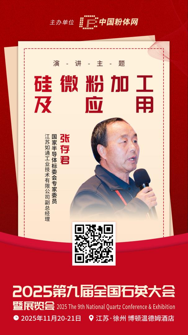 為了更深入地探討硅微粉加工技術(shù)的創(chuàng)新方向與應(yīng)用領(lǐng)域的拓展?jié)摿Γ?025年11月20-21日,中國(guó)粉體網(wǎng)將在江蘇徐州舉辦“2025(第九屆)全國(guó)石英大會(huì)暨展覽會(huì)”。屆時(shí),國(guó)家半導(dǎo)體標(biāo)委會(huì)專(zhuān)家委員、江蘇如通工業(yè)技術(shù)有限公司副總經(jīng)理張存君,將帶來(lái)題為《硅微粉加工及應(yīng)用》的報(bào)告。他將結(jié)合自身深耕硅微粉領(lǐng)域的豐富經(jīng)驗(yàn),解讀硅微粉加工及應(yīng)用等相關(guān)內(nèi)容,助力推動(dòng)硅微粉產(chǎn)業(yè)的高質(zhì)量發(fā)展。