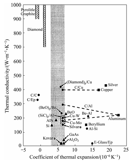 現(xiàn)有的電子封裝材料,如W-Cu、Mo-Cu、SiCp-Al、SiCp-Cu以及BeO-Cu等復(fù)合材料,均難以滿(mǎn)足未來(lái)高功率器件的散熱需求,在高輸出模塊的應(yīng)用中表現(xiàn)出局限性。行業(yè)內(nèi)追求更高導(dǎo)熱率的新型材料,金剛石銅就是其中的一種典型復(fù)合材料。