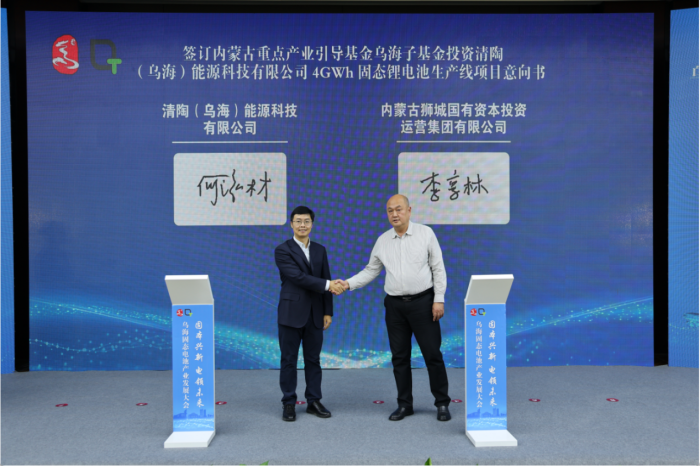 清陶烏海與內(nèi)蒙古獅城國(guó)有資本投資運(yùn)營(yíng)集團(tuán)有限公司簽訂內(nèi)蒙古重點(diǎn)產(chǎn)業(yè)引導(dǎo)基金——烏海子基金投資烏海清陶4GWh固態(tài)鋰電池生產(chǎn)線項(xiàng)目意向書,共拓發(fā)展新空間。