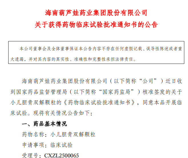 中國(guó)粉體網(wǎng)訊 10月27日,ST葫蘆娃發(fā)布公告,宣布公司近日已獲得國(guó)家藥品監(jiān)督管理局核準(zhǔn)簽發(fā)的關(guān)于中藥創(chuàng)新藥小兒膽青雙解顆粒的《藥物臨床試驗(yàn)批準(zhǔn)通知書》,該通知書同意小兒膽青雙解顆粒開展臨床試驗(yàn)。