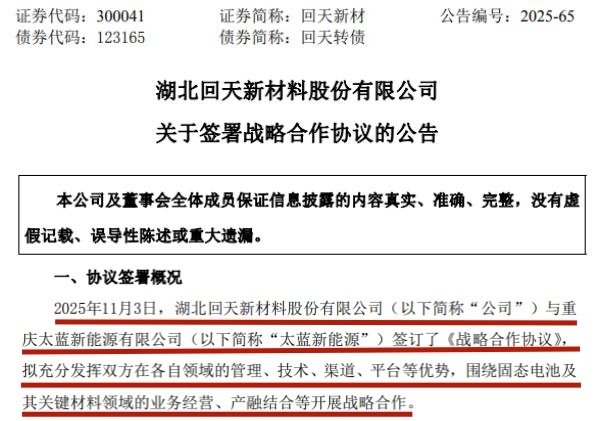 中國粉體網(wǎng)訊  11月3日,湖北回天新材料股份有限公司(簡稱:回天新材)發(fā)布公告稱,公司與重慶太藍(lán)新能源有限公司(簡稱:太藍(lán)新能源)簽訂了《戰(zhàn)略合作協(xié)議》,擬充分發(fā)揮雙方在各自領(lǐng)域的管理、技術(shù)、渠道、平臺等優(yōu)勢,圍繞固態(tài)電池及其關(guān)鍵材料領(lǐng)域的業(yè)務(wù)經(jīng)營、產(chǎn)融結(jié)合等開展戰(zhàn)略合作。