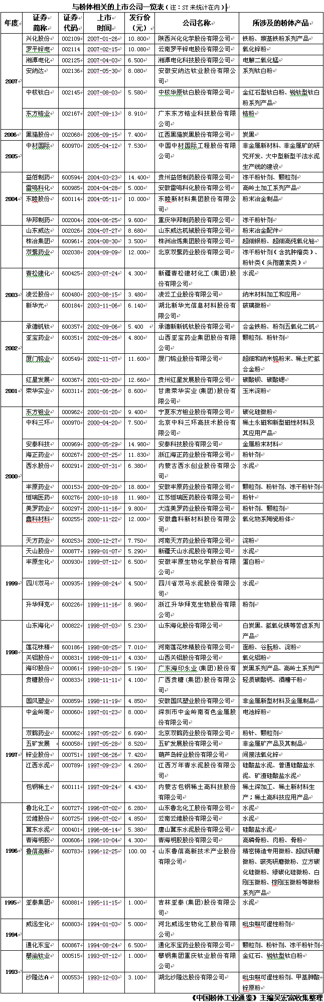 “無(wú)細(xì)不成體,有粉能為材”。這是我國(guó)著名材料專家、原國(guó)際材聯(lián)主席李恒德院士高度評(píng)價(jià)粉體技術(shù)對(duì)于材料工業(yè)的重要性。超微粉體是許多新材料的基礎(chǔ)材料,廣泛應(yīng)用于化工、冶金、礦業(yè)、建材、日化、食品、醫(yī)藥、農(nóng)業(yè)、環(huán)保和航空航天等國(guó)民經(jīng)濟(jì)的各個(gè)領(lǐng)域,為上市公司所青睞。據(jù)不完全統(tǒng)計(jì),截止2008年3月,在目前我國(guó)上海證券交易所和深圳證券交易所1600家左右的上市公司中,約有60家上市公司的產(chǎn)品涉及粉體種類。