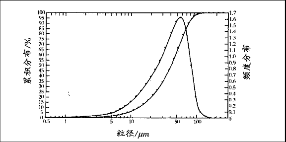 粒徑及粒徑分布的測定是激光粒度儀最普遍的用途。對粉末涂料,已發(fā)布的國際標準ISO8310—13CoatingPowders2Part13:ParticleSizeAnalysisbyLaserDiffraction規(guī)定了用激光衍射法直接測量粉末涂料等效球體粒徑分布的方法。實際上該測試方法也適用其他干粉狀試樣的粒度測試。依照此測試方法曾對粉末涂料、二氧化鈦、鐵紅、珠光顏料、磷酸鋅、硫酸鋇、鋅粉等多種粉狀試樣進行了粒度分布的測試。圖1為某種粉末涂料的粒度分布曲線(激光粒度儀還有以表格法、函數(shù)法表示的粒度分布以及其它一些粒徑參數(shù)值,在此從略)。