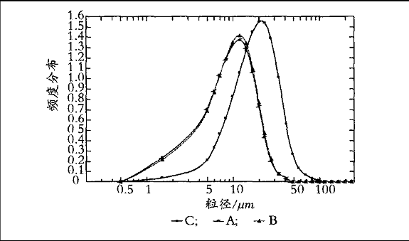 在涂料工業(yè)中常遇到同一配方在不同廠或同一廠不同批次的產品質量不同的情況,以及產品在貯存期間質量發(fā)生變化的問題。這些情況用傳統(tǒng)的質量控制方法往往不易察覺,而用激光粒度法有助于解決這類問題。圖3為同一廠家制造的三批組成及生產工藝相同的珠光顏料的粒徑分布圖,其中樣品A為參比樣。由圖3分布曲線可知,樣品B與樣品A的粒徑分布基本相同,而樣品C的粗粉含量較多。從廠家反饋的信息也證實,樣品B的使用效果滿足要求,而樣品C因含有較多的粗顆粒,使用效果不及樣品B。