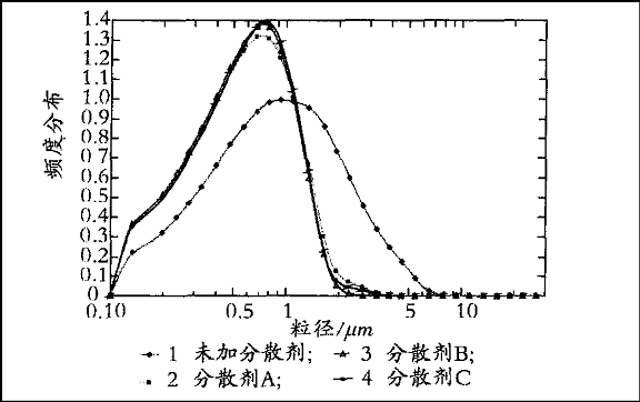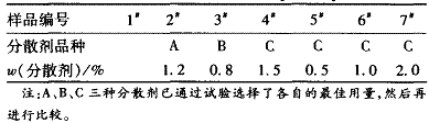 分散劑是添加了固體粉料的涂料及相關產品(如著色涂料和顏料漿等)體系中不可缺少的添加劑之一。若分散劑選擇不當或用量不合適,會造成顏填料不能分散到需要的細度,分散體系不穩(wěn)定,從而影響涂料的使用性能。如以二氧化鈦顏料漿中分散劑的選擇為例,借助激光粒度儀的測試結果確定分散劑的品種及用量。表1列出了試驗時選用的幾種分散劑及用量的配比。試驗時除了改變分散劑的品種及用量外,其余組分的品種和用量以及試驗條件完全相同。