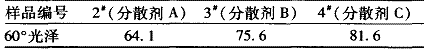 進一步對分散劑C的用量進行試驗,圖5為粒徑分布曲線;圖6為分散劑C用量與顏料漿黏度的關系圖;圖7為分散劑C用量與涂膜光澤的關系圖。從圖5可觀察到015%的用量,還不能使顆粒分散至需要的粒徑,且顏料漿的黏度偏大(見圖 6),涂膜的光澤偏低(見圖7)。1.0%及以上的用量可滿足實際應用的需要,已達到理想的分散效果。綜合考慮各種因素后確定分散劑C的用量為1.5%。