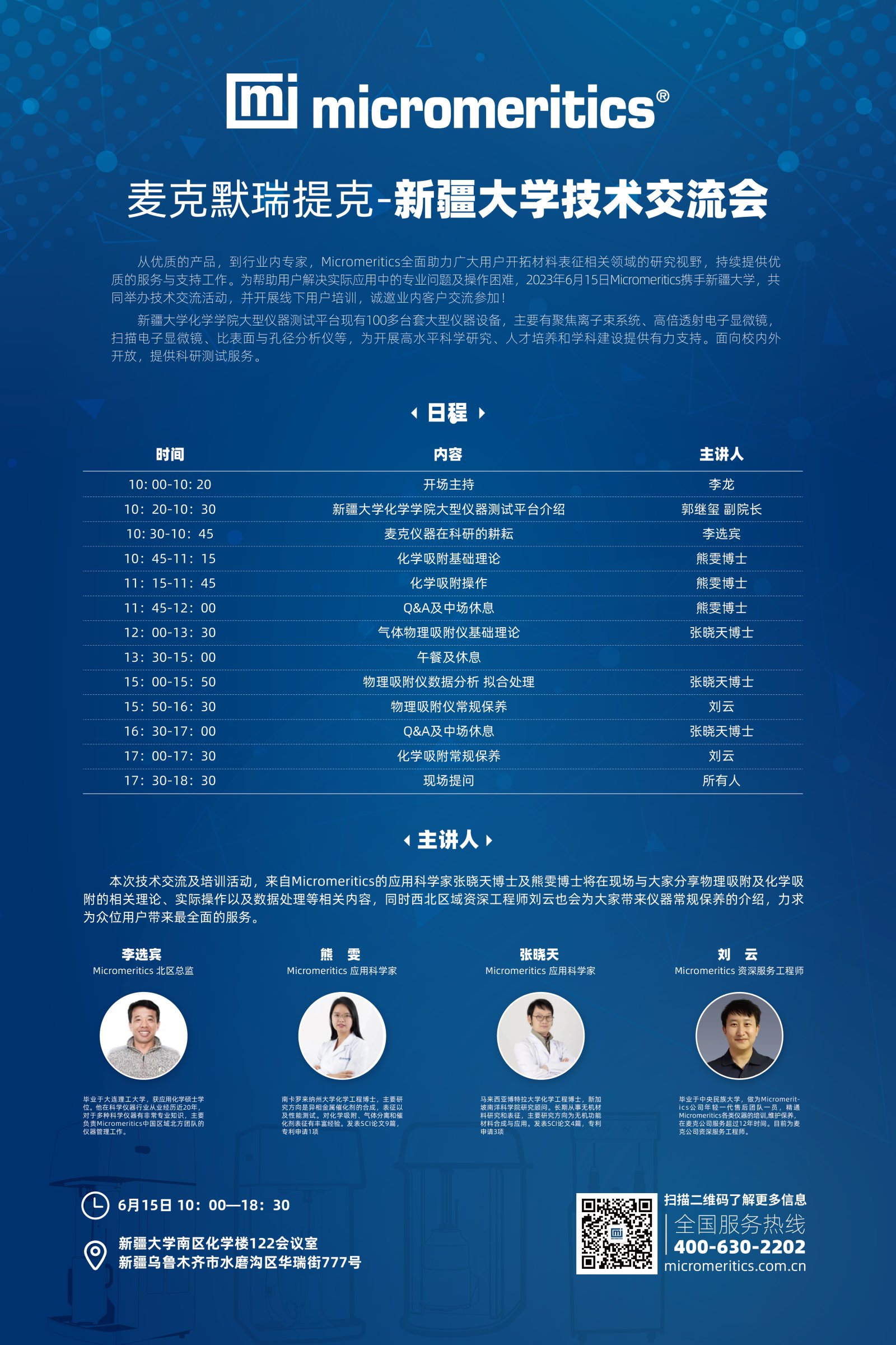 從優(yōu)質(zhì)的產(chǎn)品,到行業(yè)內(nèi)專家,Micromeritics全面助力廣大用戶開拓材料表征相關領域的研究視野,持續(xù)提供優(yōu)質(zhì)的服務與支持工作。為幫助用戶解決實際應用中的專業(yè)問題及操作困難,2023年6月15日Micromeritics攜手新疆大學,共同舉辦技術交流活動,并開展線下用戶培訓,誠邀業(yè)內(nèi)客戶交流參加!