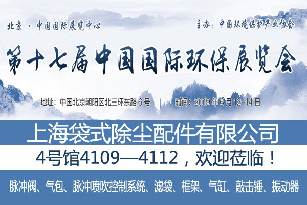 第十七屆中國(guó)國(guó)際環(huán)保展覽會(huì)(CIEPEC2019)定于2019年6月12日-14日在北京·中國(guó)國(guó)際展覽中心舉行。上海袋式除塵配件有限公司攜手寧波盛達(dá)陽(yáng)光自動(dòng)化科技有限公司共同亮相展會(huì)。