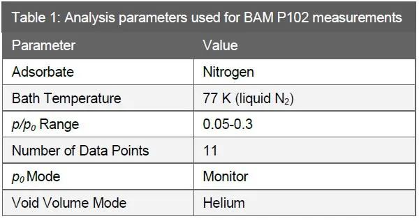 在測量BET比表面積時,樣品的總表面積(m2)是獲得準確和可重復性結果的關鍵。必須有足夠的面積使氮氣吸附,以產(chǎn)生儀器能夠準確檢測到的壓力變化。使用標準樣品BAM P102在安東帕Nova 800(長樣品管)和Nova 600 BET(短樣品管)上進行總表面積(m2)和重復性之間的相關性研究。在這兩種儀器上,都使用了帶有填充棒的9毫米大球泡樣品管。表1給出了用于測量的分析參數(shù)。