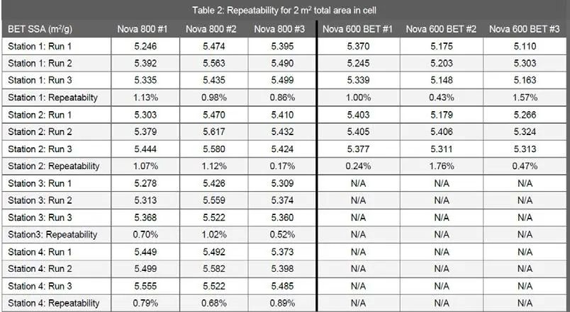 3臺Nova 800和3臺Nova 600 BET儀器的結果如表2所示。所有測試結果都符合BAM P102要求。結果發(fā)現(xiàn),在所有6臺儀器上,樣品管的總表面積為2 m2時,重復性< 2%。對同一類型的不同儀器上的測試結果進行重現(xiàn)性計算,Nova 800和Nova 600 BET的重現(xiàn)性分別為1.77%和1.84%。