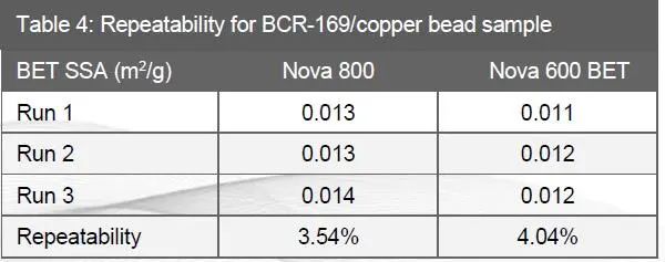 Nova 800 和Nova 600 BET 的結果如表4 所示。對于Nova 800,加入了27.9311 g(總表面積0.37 m2)的樣品用于測量,對于Nova 600 BET,加入了30.7453 g(總表面積0.36 m2)的樣品用于測量。所有測量結果的BET 相關系數(shù)都大于0.999。Nova 800 的重復性為3.54%,Nova 600 BET 的重復性為4.04%。三種測量方法的BET 表面積值僅變化0.001 m2/g,但由于整體表面積較低,即使是很小的差異也會導致重復性變大, 約3-4%。
