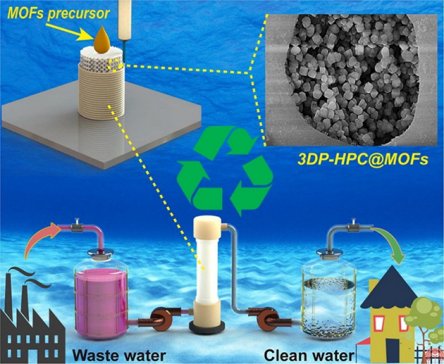 中國科學院蘭州化學物理研究所研究員王曉龍團隊與蘭州大學副教授周林成團隊合作,結合3D打印技術在復雜器件構筑及自由設計、制造與成型等領域的優(yōu)勢,開展了3D打印MOFs修飾的多孔陶瓷催化材料與器件研究,用于水體有機污染物催化降解。